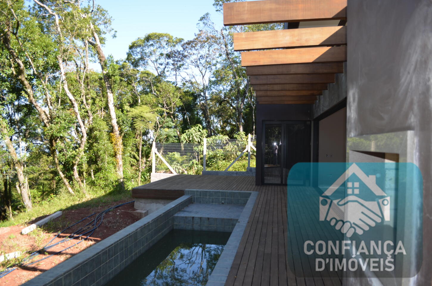 ✔ Piscina linear com borda infinita e deck que conecta à casa.